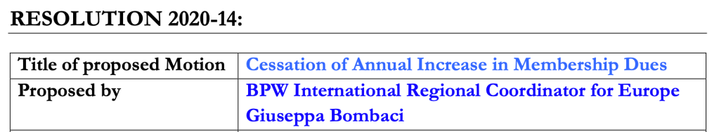 Die Resolution 2020-14 sieht einen vollständigen Stopp dieser jährlichen Erhöhung vor. Die alternative Resolution dazu, die 1 Euro Erhöhung pro Mitglied und pro Triennium vorschlug, wurde nicht in Betracht gezogen, da die Resolution 2020-14 angenommen wurde.