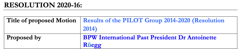 Der PILOT zu den BPW International Member Projects, Experts sowie Club & Federations Projects wird wie bis anhin weitergeführt. Die Projekte werden auf der speziell dafür erstellten Website publiziert www.bpw-projects.org Auf dieser Website sind auch alle Unterlagen für die Anmeldung zur Verfügung gestellt, sei es für BPW International Member Projects oder für Club & Federations Projects oder auch als Expert. Das Projekt BPW International PILOT soll die Arbeit von BPW weltweit sichtbar machen.