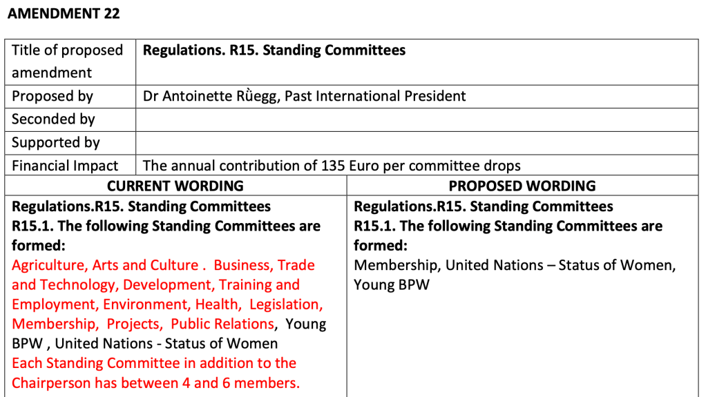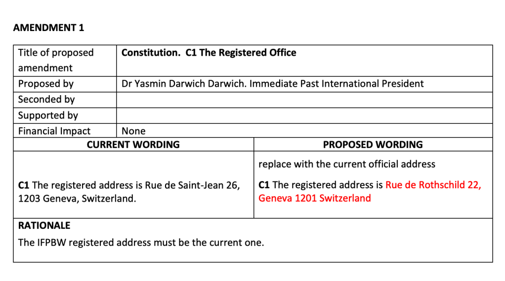 BPW Switzerland hatte in einem Friendly Amendment zum Amendment 1 die Adresse von BPW Switzerland als Adresse für BPW International angeboten. Dieser Vorschlag erreichte die notwendige ⅔ Mehrheit nicht, so dass nun weiterhin die nicht mehr gültige Adresse – Rue de Saint-Jean 26, 1203 Geneva – in den Statuten steht.